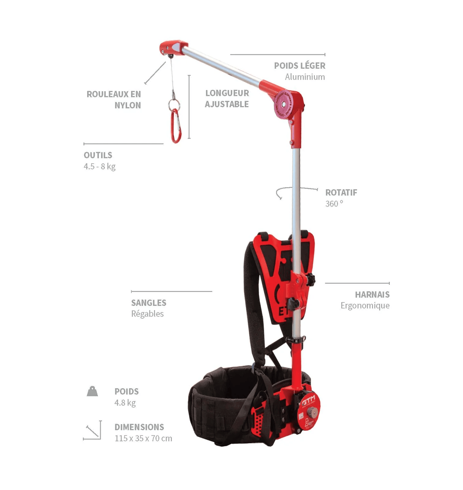 Le harnais pour taille-haie GTM Elephants Trunk 3 est l'équipement indispensable pour les travaux de taille intensifs. Ce système ergonomique, célèbre sous le nom de "trompe d'éléphant", absorbe le poids de votre taille-haie (entre 4,5 et 8 kg) pour le redistribuer sur vos hanches. Il permet une manipulation précise de votre machine tout en éliminant les tensions musculaires dans le dos et les bras.